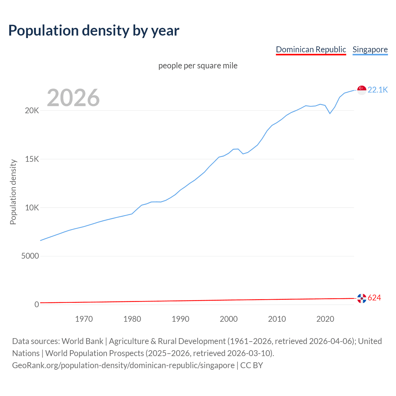 From 2006 to 2026, population density in the Dominican Republic increased by 24.6%, compared to a 34.3% growth in Singapore.