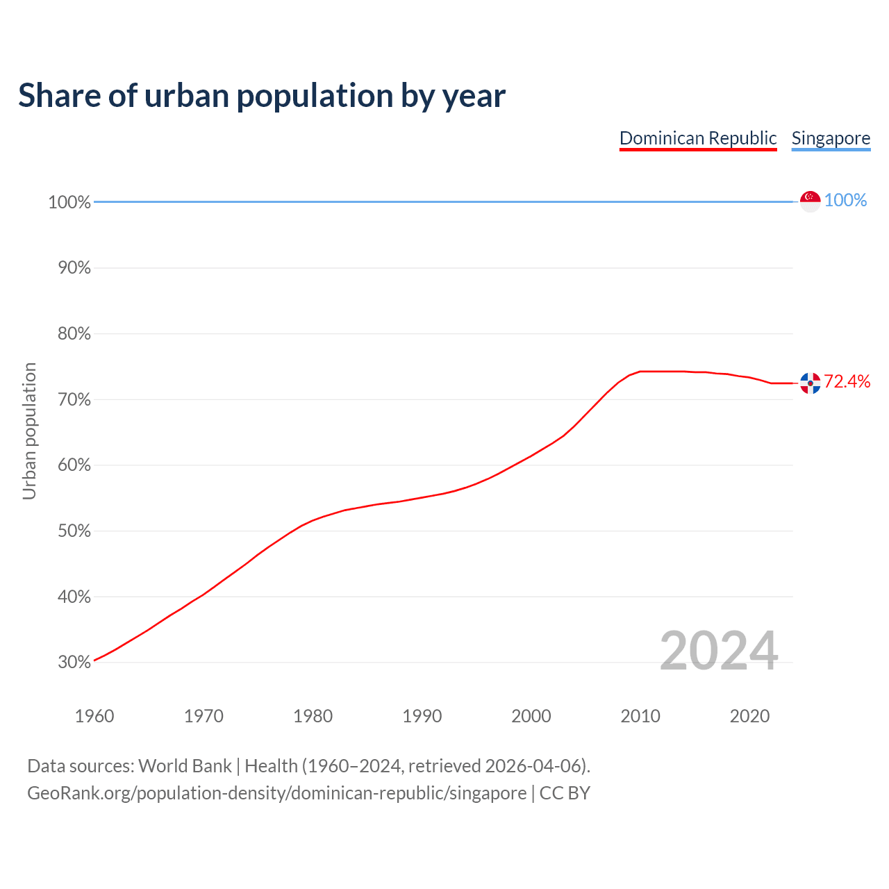 From 2004 to 2024, the share of urban population changed from 65.9% to 72.4% in the Dominican Republic and from 100% to 100% in Singapore.