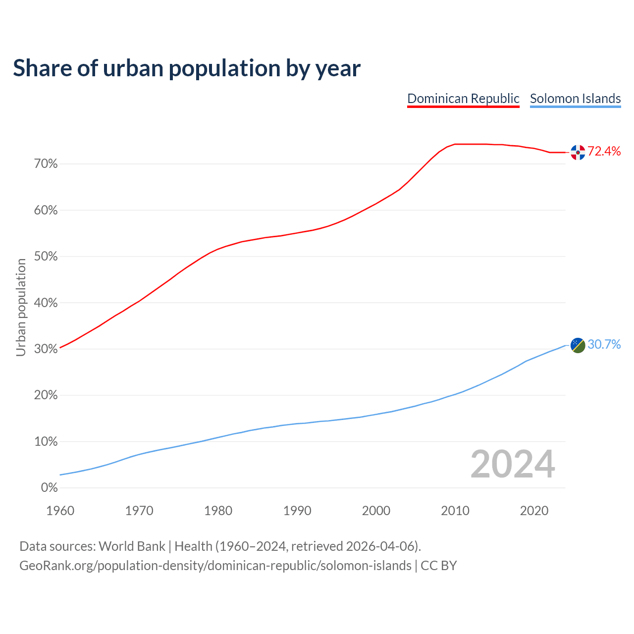 From 2004 to 2024, the share of urban population changed from 65.9% to 72.4% in the Dominican Republic and from 17.2% to 30.7% in the Solomon Islands.