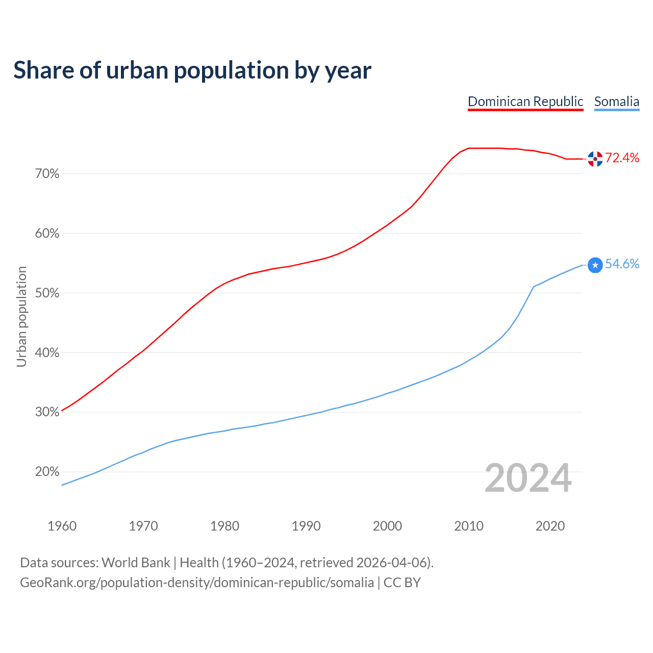From 2004 to 2024, the share of urban population changed from 65.9% to 72.4% in the Dominican Republic and from 35% to 54.6% in Somalia.