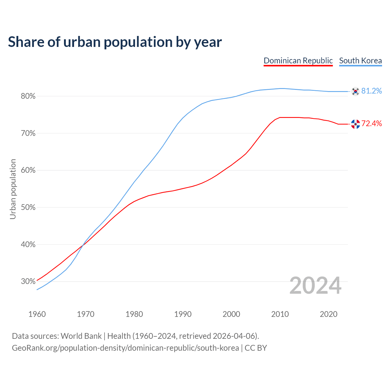 From 2004 to 2024, the share of urban population changed from 65.9% to 72.4% in the Dominican Republic and from 81.1% to 81.2% in South Korea.