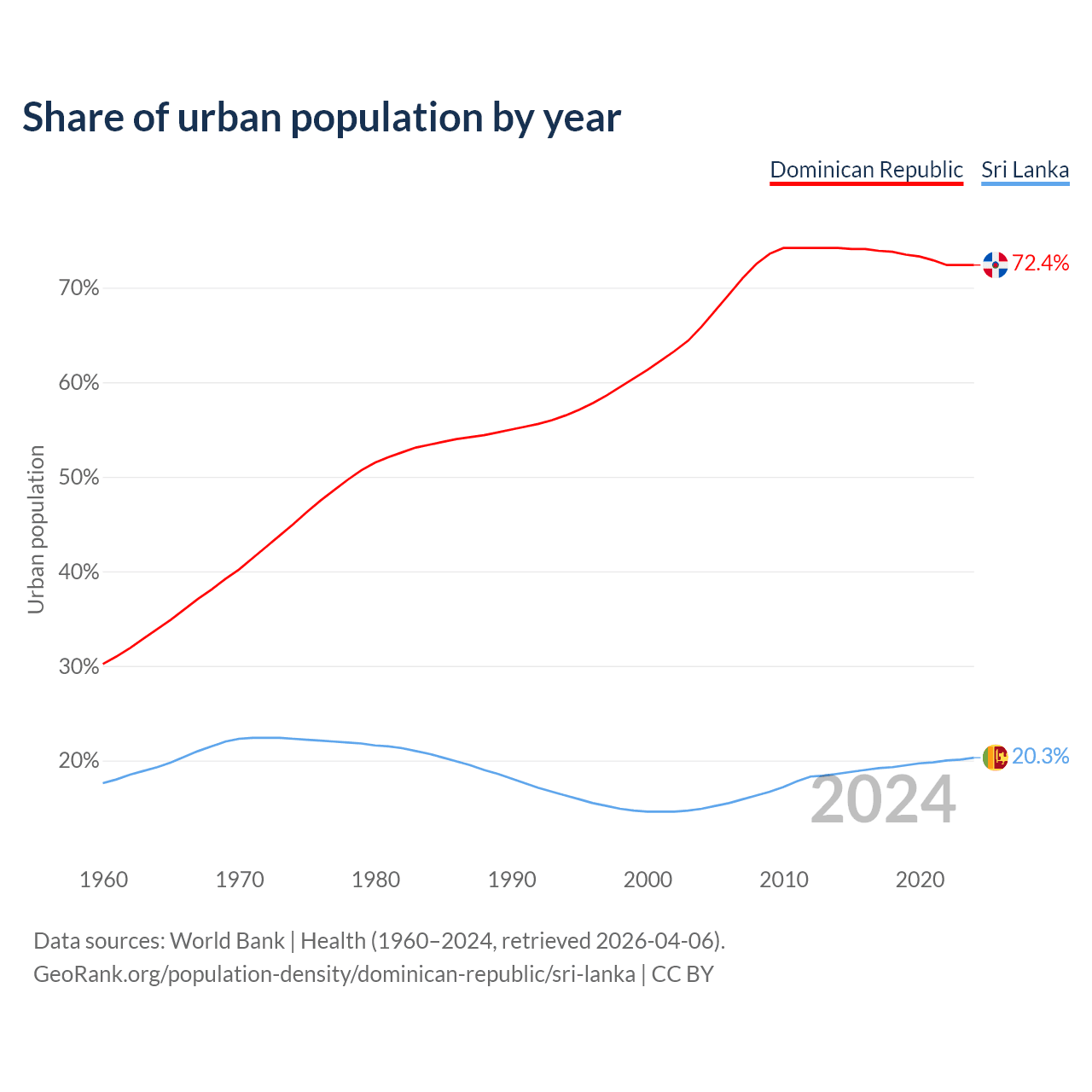 From 2004 to 2024, the share of urban population changed from 65.9% to 72.4% in the Dominican Republic and from 14.9% to 20.3% in Sri Lanka.