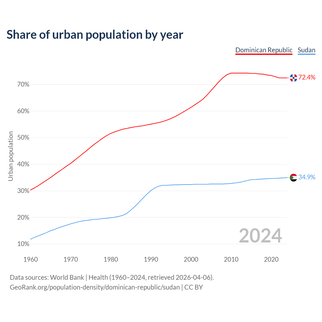 From 2004 to 2024, the share of urban population changed from 65.9% to 72.4% in the Dominican Republic and from 32.4% to 34.9% in Sudan.