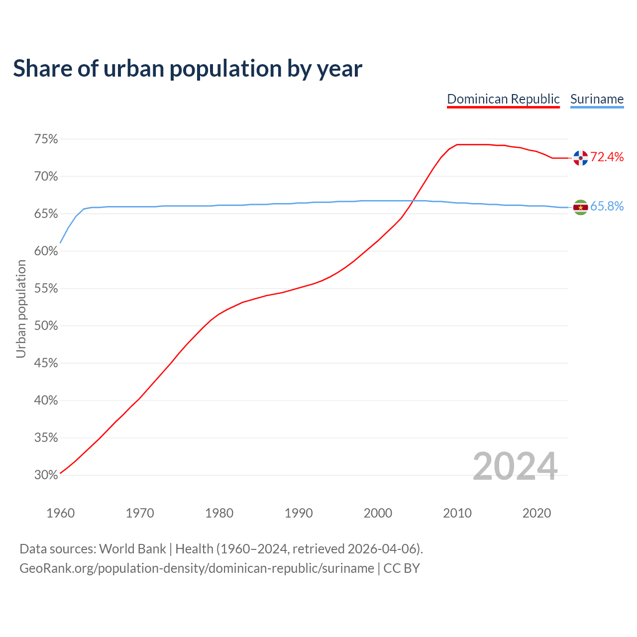 From 2004 to 2024, the share of urban population changed from 65.9% to 72.4% in the Dominican Republic and from 66.7% to 65.8% in Suriname.
