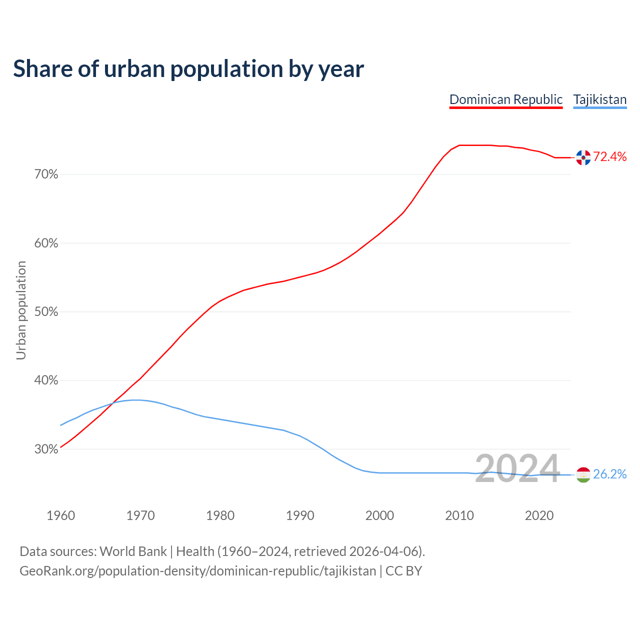 From 2004 to 2024, the share of urban population changed from 65.9% to 72.4% in the Dominican Republic and from 26.5% to 26.2% in Tajikistan.
