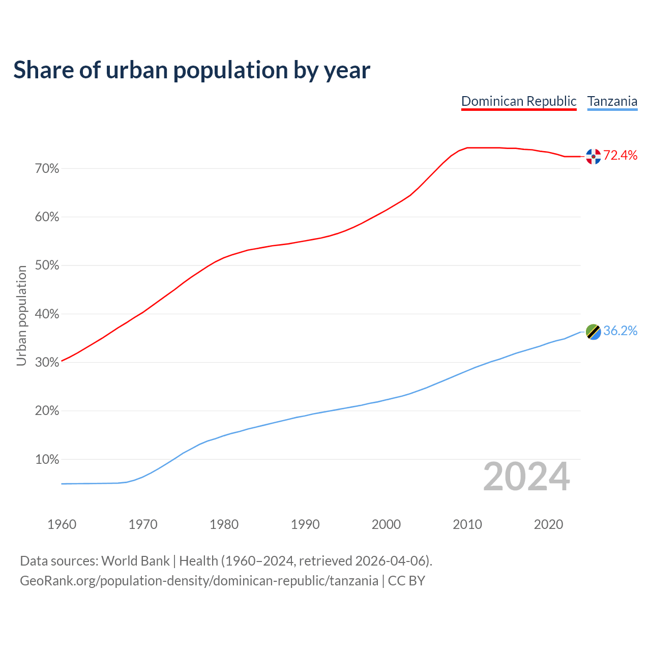 From 2004 to 2024, the share of urban population changed from 65.9% to 72.4% in the Dominican Republic and from 24.1% to 36.2% in Tanzania.