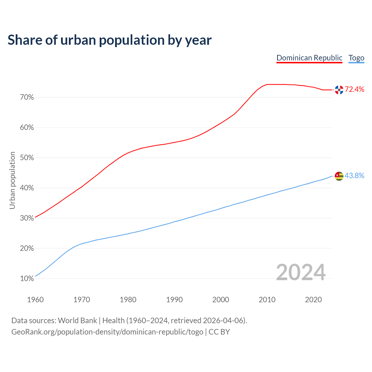 From 2004 to 2024, the share of urban population changed from 65.9% to 72.4% in the Dominican Republic and from 34.9% to 43.8% in Togo.