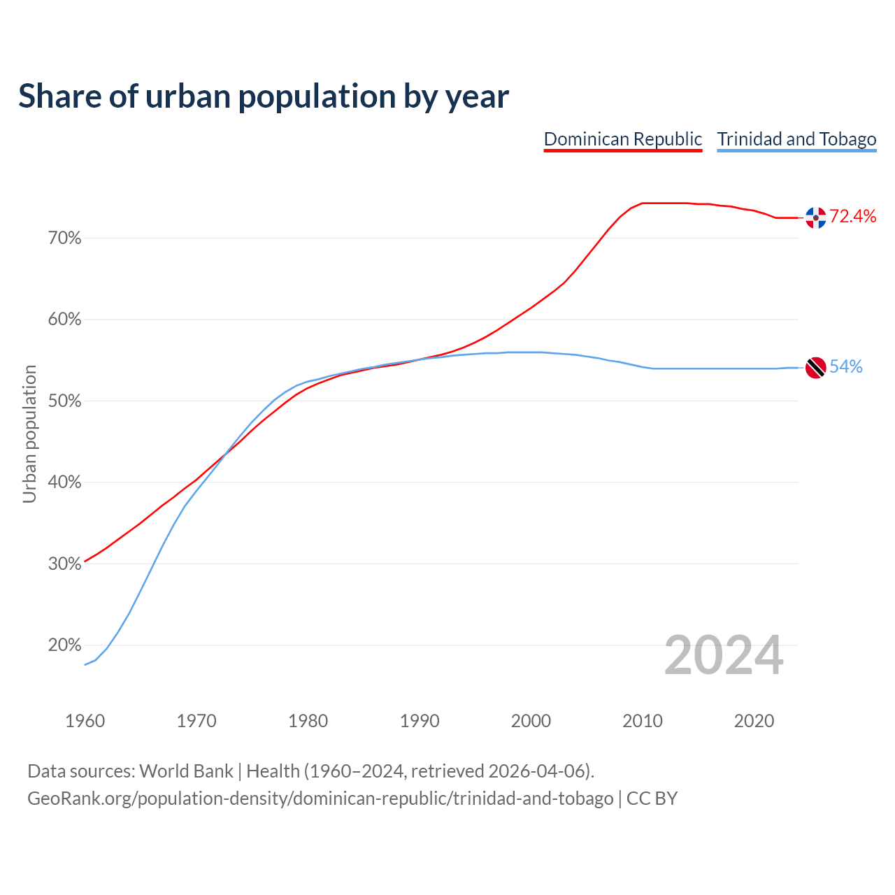 From 2004 to 2024, the share of urban population changed from 65.9% to 72.4% in the Dominican Republic and from 55.6% to 54% in Trinidad and Tobago.