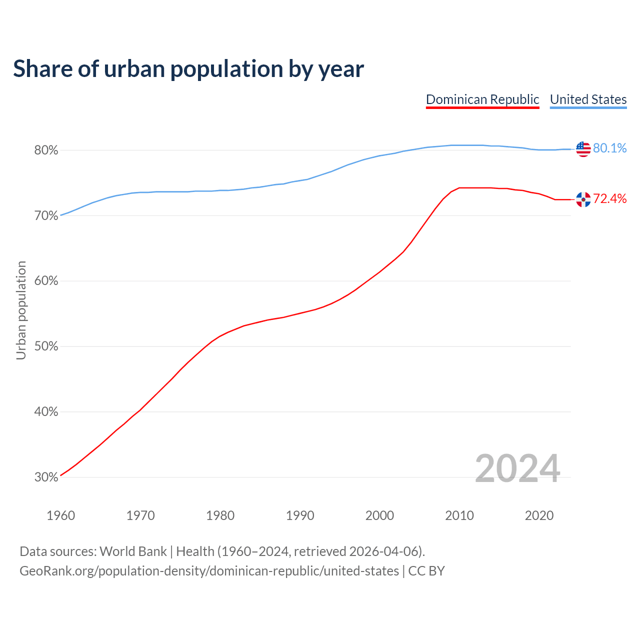 From 2004 to 2024, the share of urban population changed from 65.9% to 72.4% in the Dominican Republic and from 80% to 80.1% in the United States.
