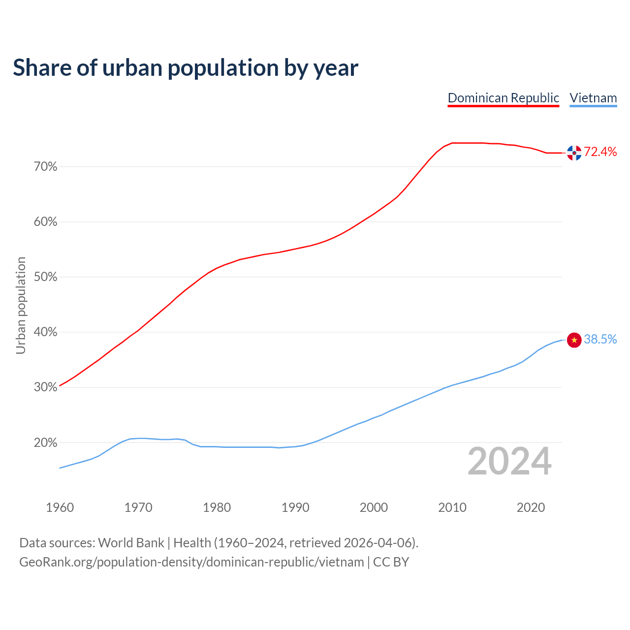 From 2004 to 2024, the share of urban population changed from 65.9% to 72.4% in the Dominican Republic and from 26.8% to 38.5% in Vietnam.