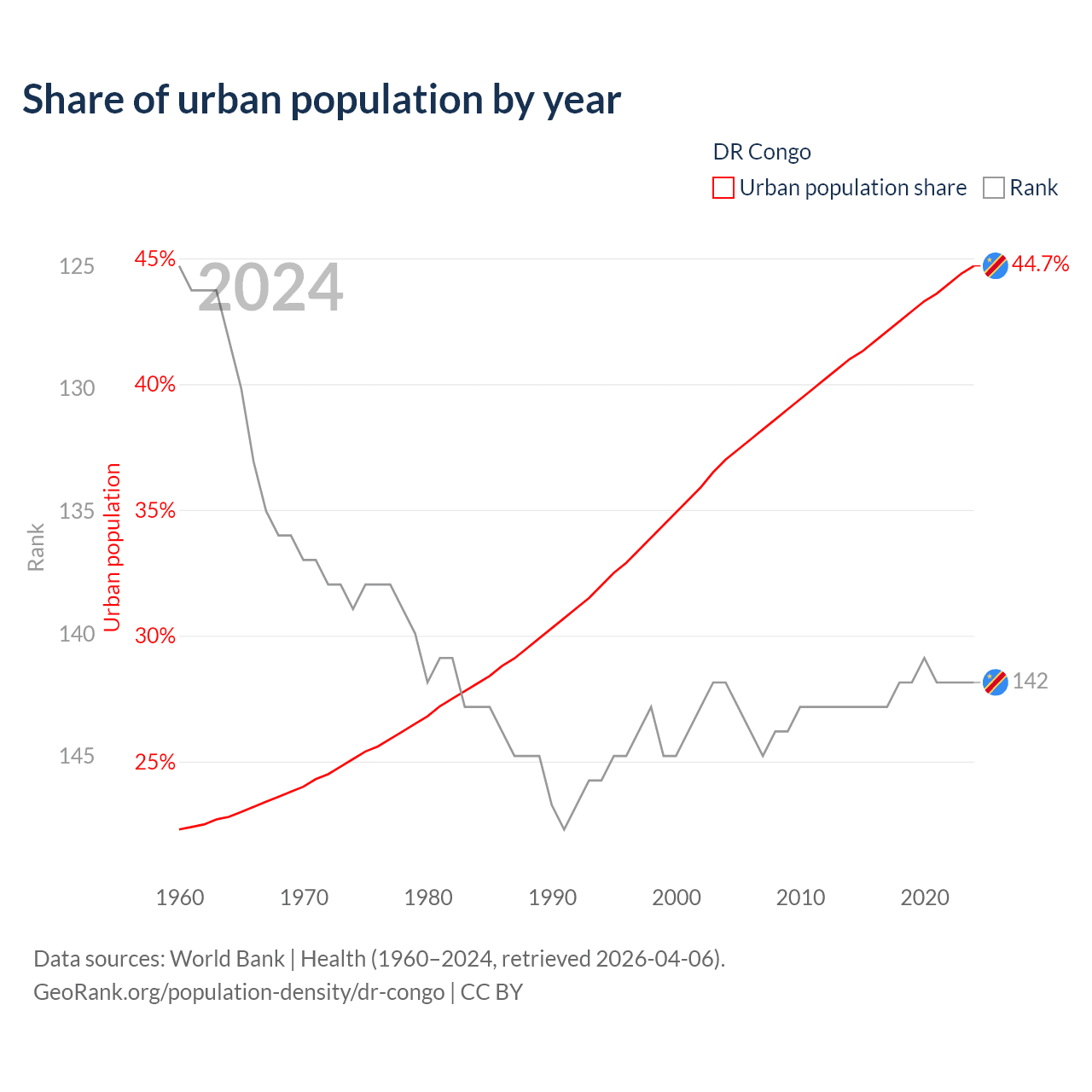 This chart shows the share of urban population in the DR Congo from 1960 to 2024: 22.3% lived in urban areas in 1960, 34.9% in 2000, and 44.7% in 2024.