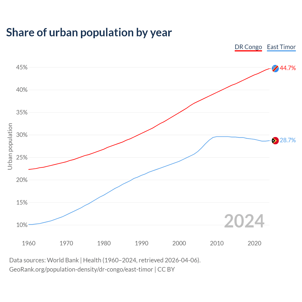 From 2004 to 2024, the share of urban population changed from 37% to 44.7% in the DR Congo and from 25.7% to 28.7% in East Timor.