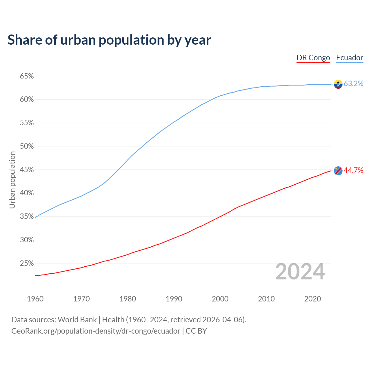 From 2004 to 2024, the share of urban population changed from 37% to 44.7% in the DR Congo and from 61.8% to 63.2% in Ecuador.