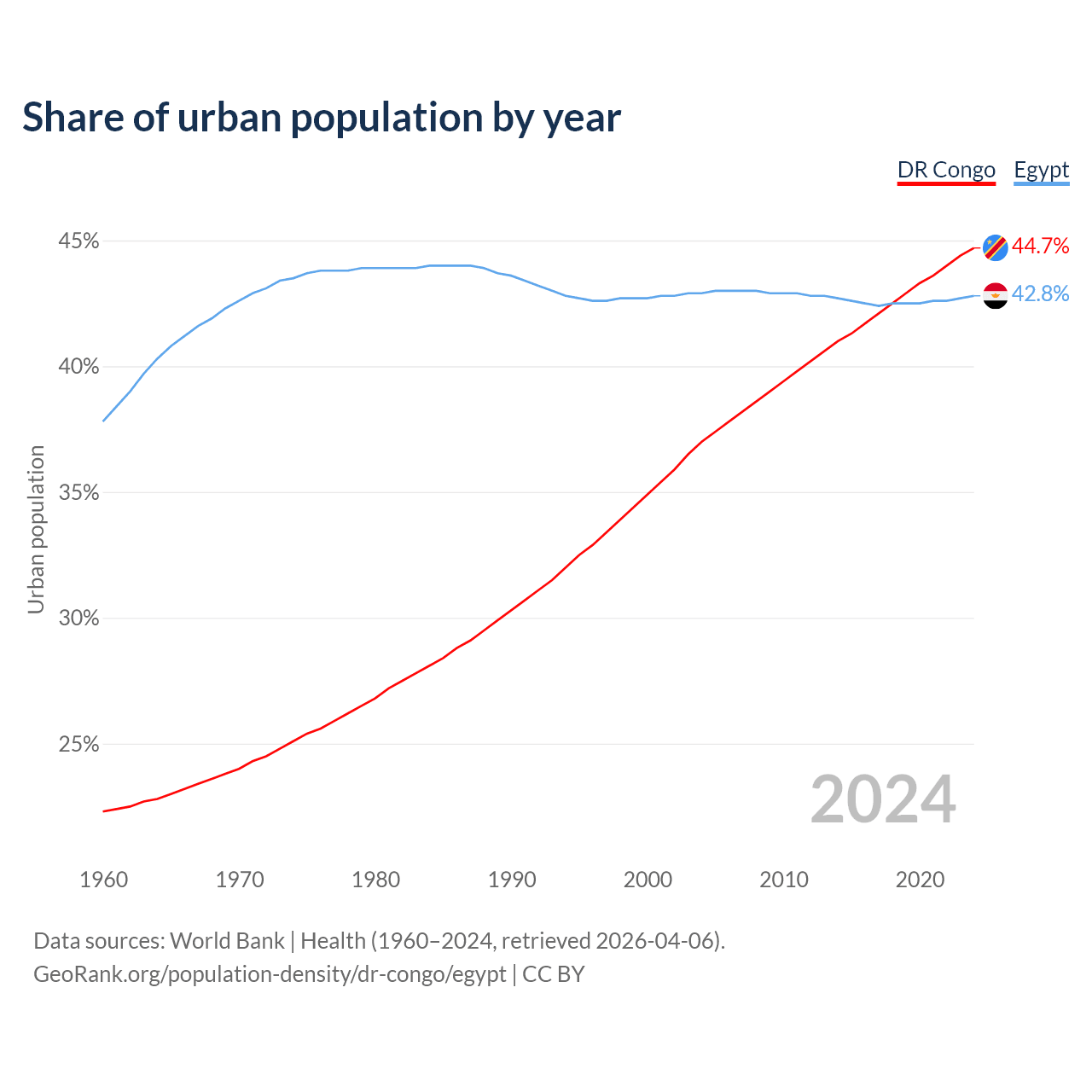 From 2004 to 2024, the share of urban population changed from 37% to 44.7% in the DR Congo and from 42.9% to 42.8% in Egypt.