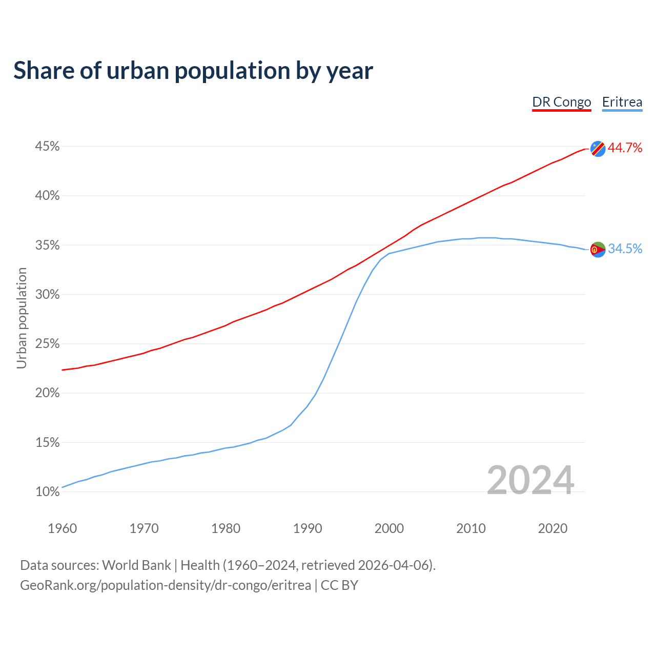 From 2004 to 2024, the share of urban population changed from 37% to 44.7% in the DR Congo and from 34.9% to 34.5% in Eritrea.