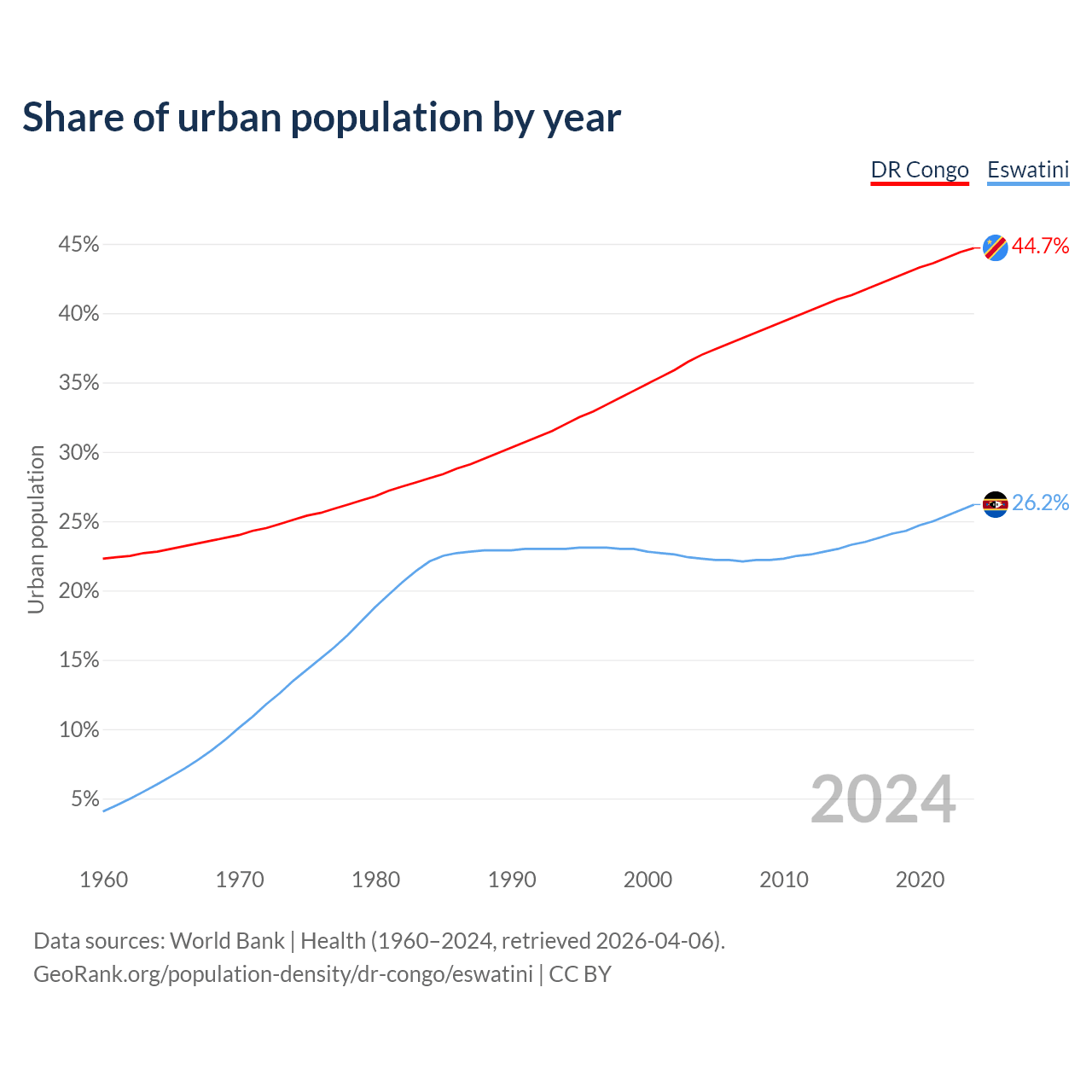 From 2004 to 2024, the share of urban population changed from 37% to 44.7% in the DR Congo and from 22.3% to 26.2% in Eswatini.