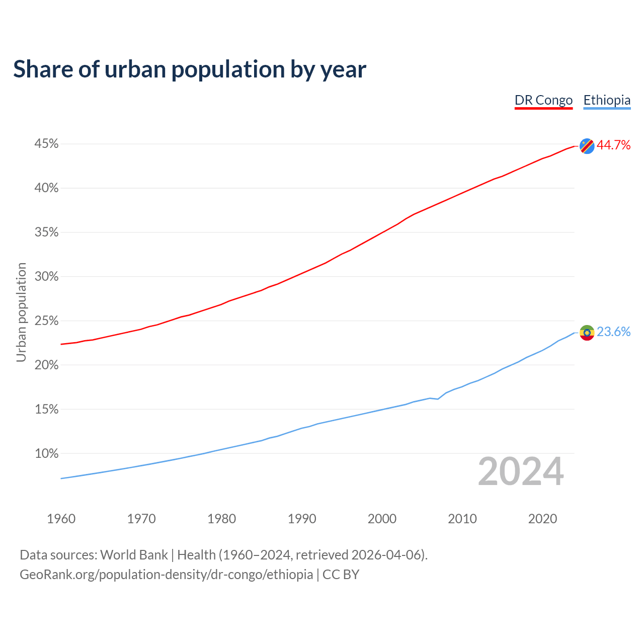 From 2004 to 2024, the share of urban population changed from 37% to 44.7% in the DR Congo and from 15.8% to 23.6% in Ethiopia.