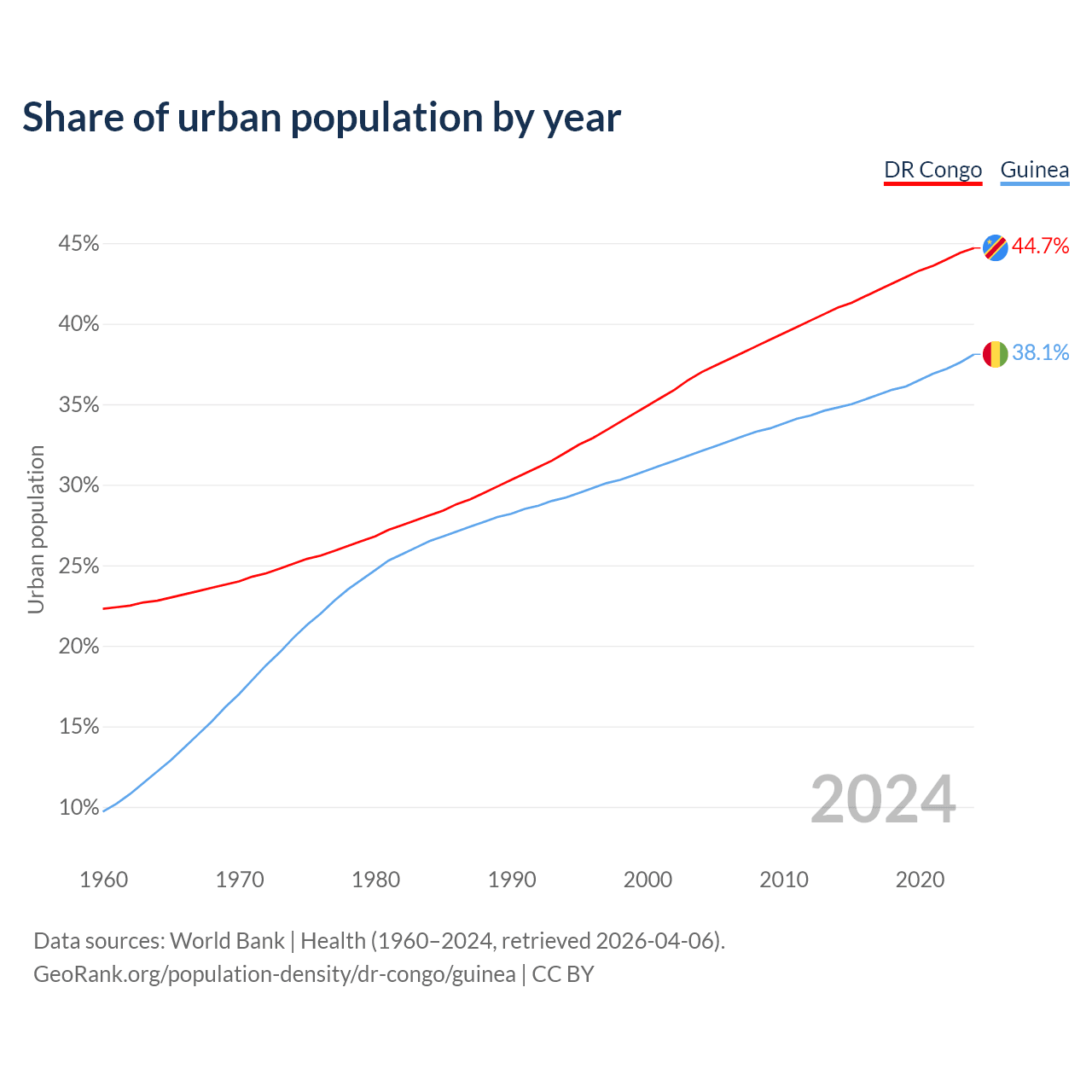 From 2004 to 2024, the share of urban population changed from 37% to 44.7% in the DR Congo and from 32.1% to 38.1% in Guinea.