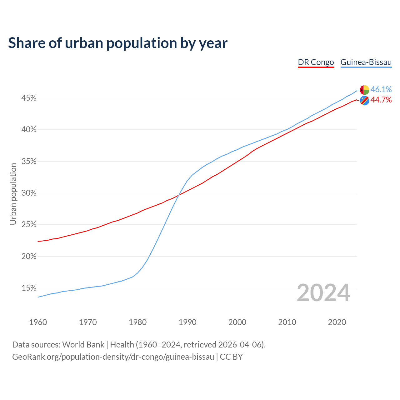 From 2004 to 2024, the share of urban population changed from 37% to 44.7% in the DR Congo and from 38.1% to 46.1% in Guinea-Bissau.