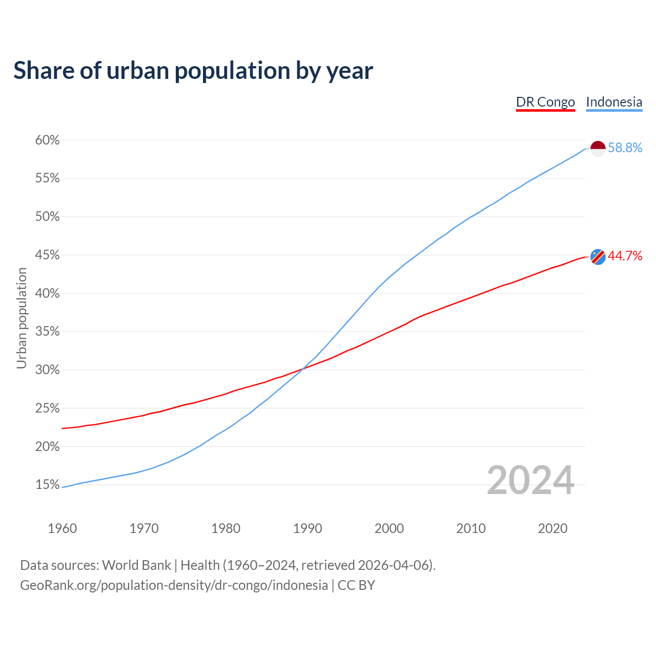 From 2004 to 2024, the share of urban population changed from 37% to 44.7% in the DR Congo and from 45.4% to 58.8% in Indonesia.