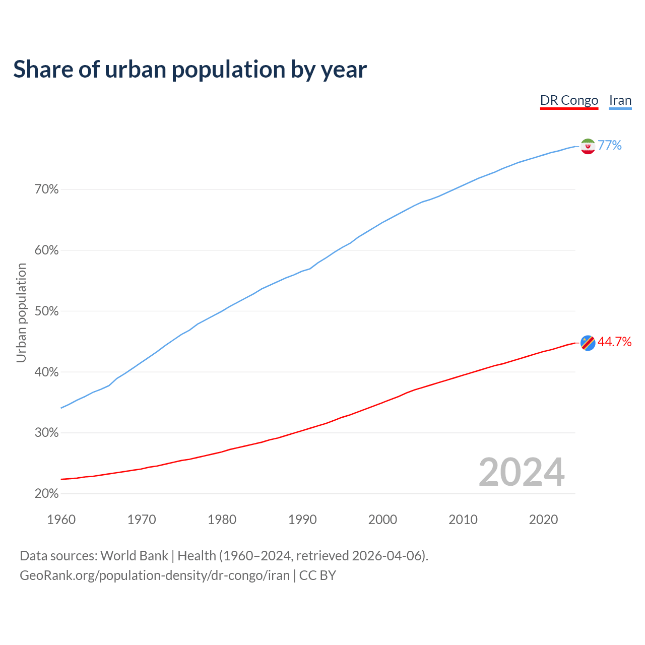 From 2004 to 2024, the share of urban population changed from 37% to 44.7% in the DR Congo and from 67.3% to 77% in Iran.