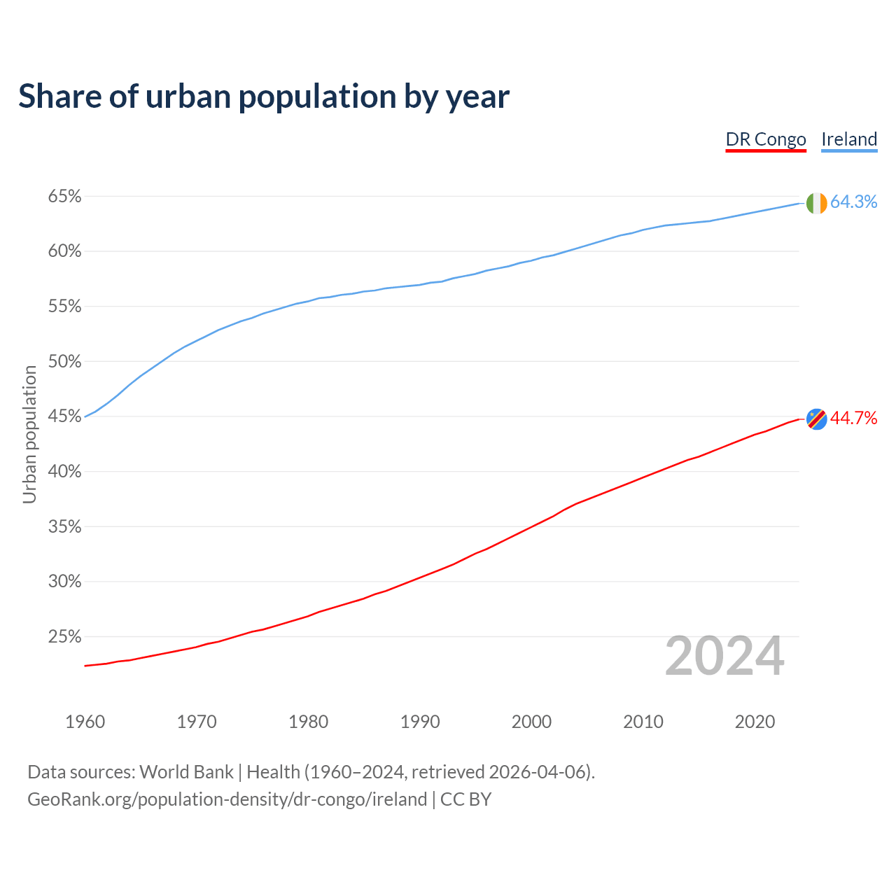 From 2004 to 2024, the share of urban population changed from 37% to 44.7% in the DR Congo and from 60.2% to 64.3% in Ireland.