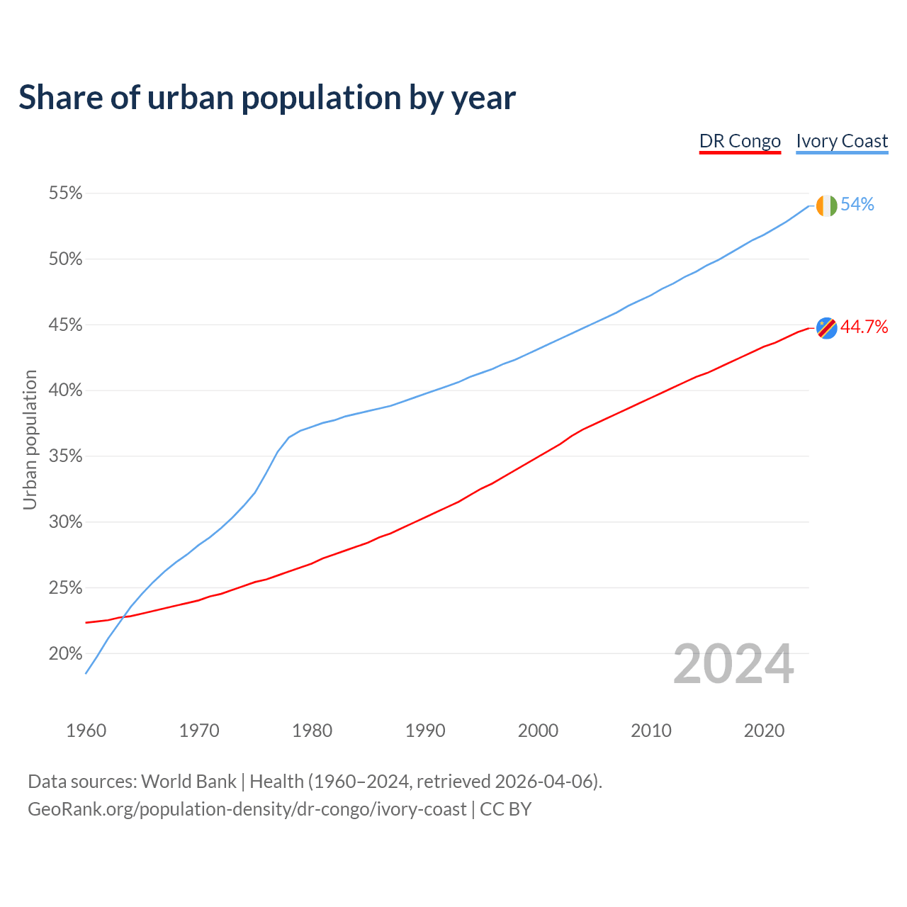 From 2004 to 2024, the share of urban population changed from 37% to 44.7% in the DR Congo and from 44.7% to 54% in Ivory Coast.
