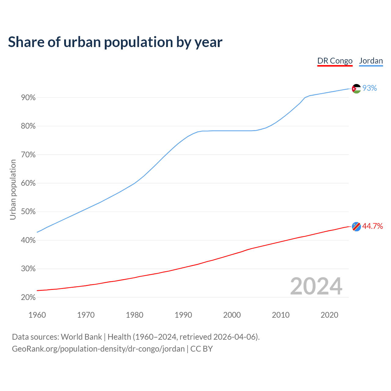 From 2004 to 2024, the share of urban population changed from 37% to 44.7% in the DR Congo and from 78.3% to 93% in Jordan.