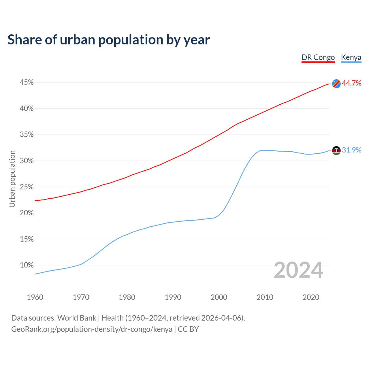 From 2004 to 2024, the share of urban population changed from 37% to 44.7% in the DR Congo and from 25.4% to 31.9% in Kenya.