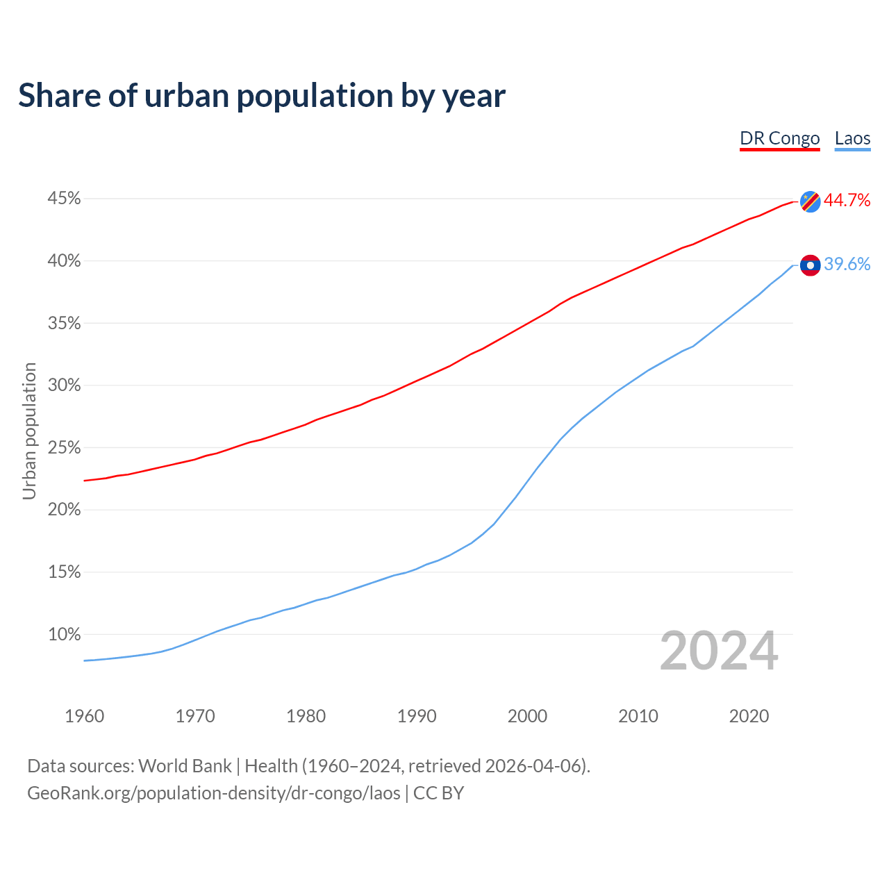 From 2004 to 2024, the share of urban population changed from 37% to 44.7% in the DR Congo and from 26.5% to 39.6% in Laos.