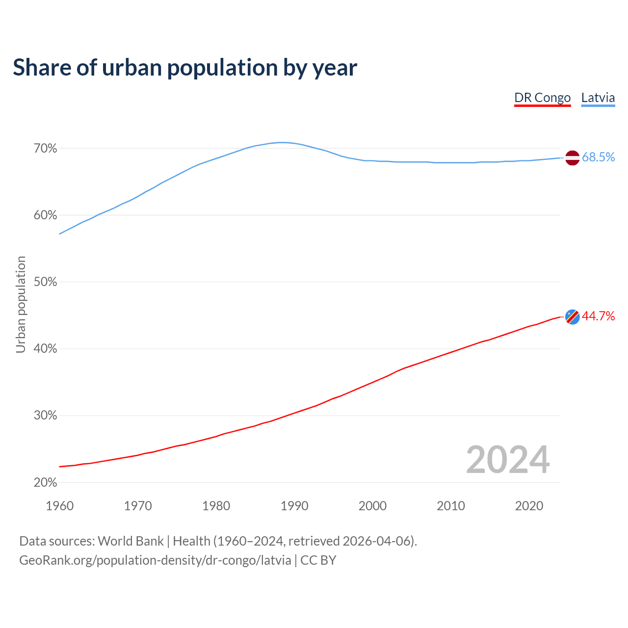 From 2004 to 2024, the share of urban population changed from 37% to 44.7% in the DR Congo and from 67.9% to 68.5% in Latvia.