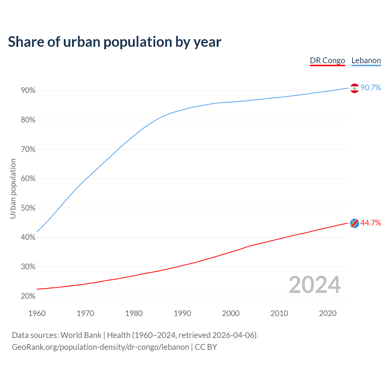 From 2004 to 2024, the share of urban population changed from 37% to 44.7% in the DR Congo and from 86.6% to 90.7% in Lebanon.