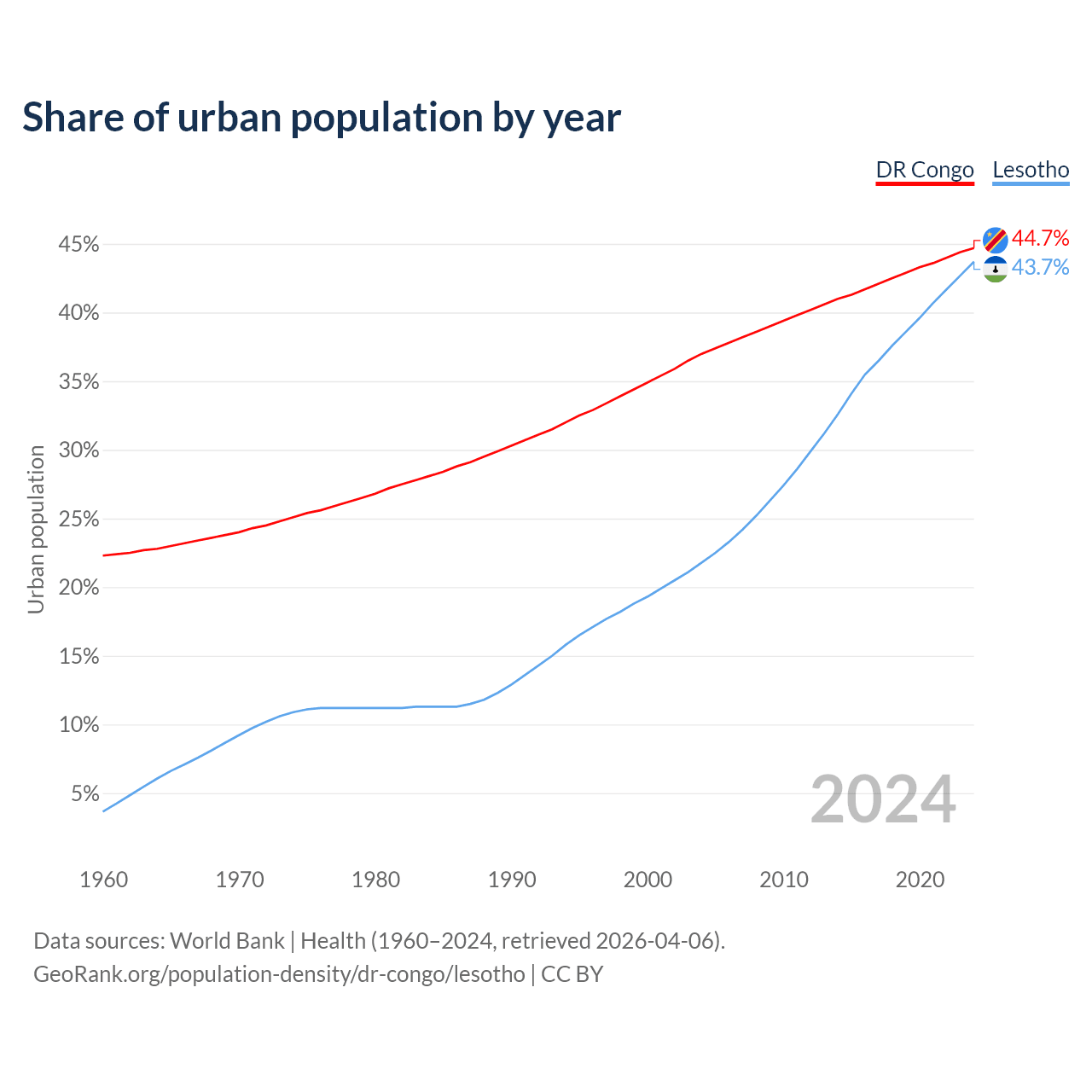 From 2004 to 2024, the share of urban population changed from 37% to 44.7% in the DR Congo and from 21.8% to 43.7% in Lesotho.