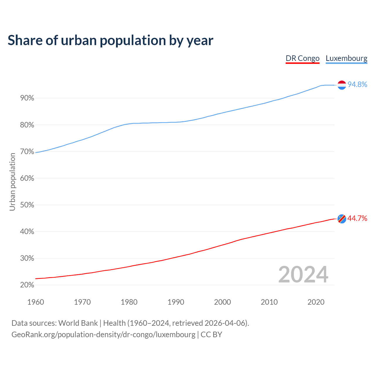 From 2004 to 2024, the share of urban population changed from 37% to 44.7% in the DR Congo and from 86% to 94.8% in Luxembourg.