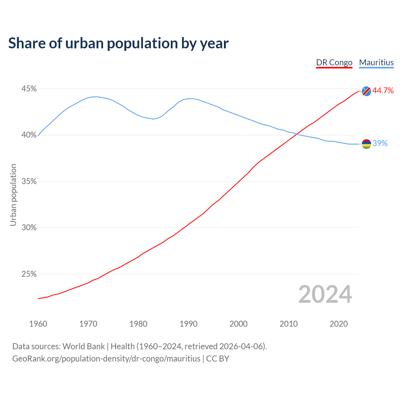 From 2004 to 2024, the share of urban population changed from 37% to 44.7% in the DR Congo and from 41.3% to 39% in Mauritius.