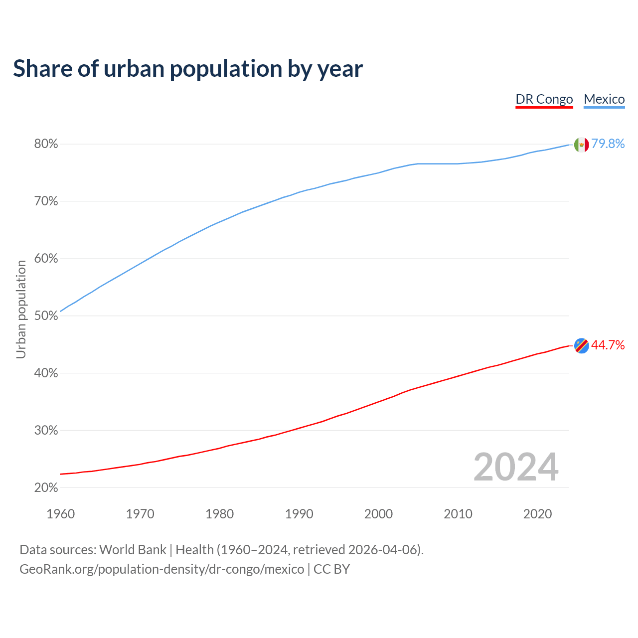 From 2004 to 2024, the share of urban population changed from 37% to 44.7% in the DR Congo and from 76.3% to 79.8% in Mexico.