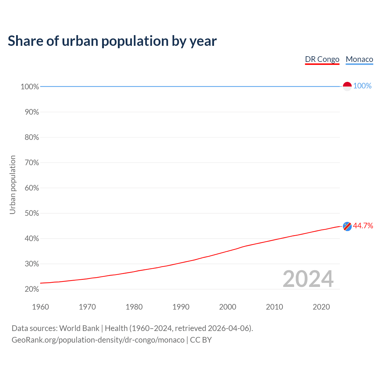 From 2004 to 2024, the share of urban population changed from 37% to 44.7% in the DR Congo and from 100% to 100% in Monaco.