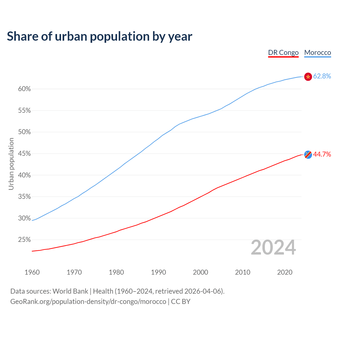 From 2004 to 2024, the share of urban population changed from 37% to 44.7% in the DR Congo and from 55% to 62.8% in Morocco.