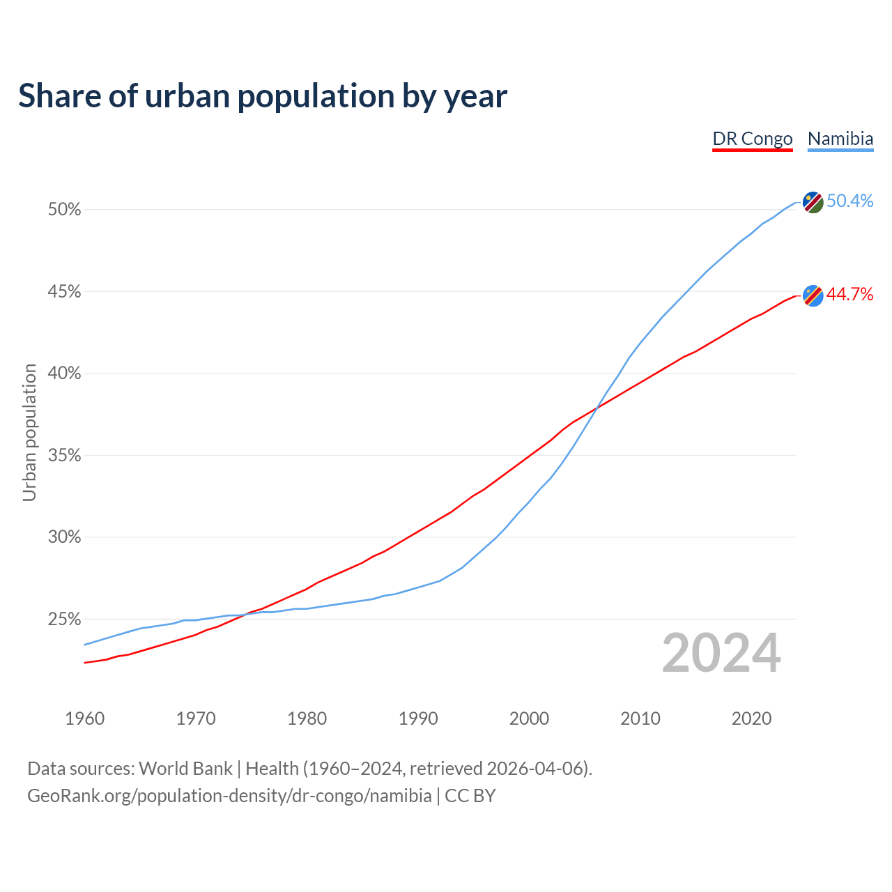 From 2004 to 2024, the share of urban population changed from 37% to 44.7% in the DR Congo and from 35.5% to 50.4% in Namibia.