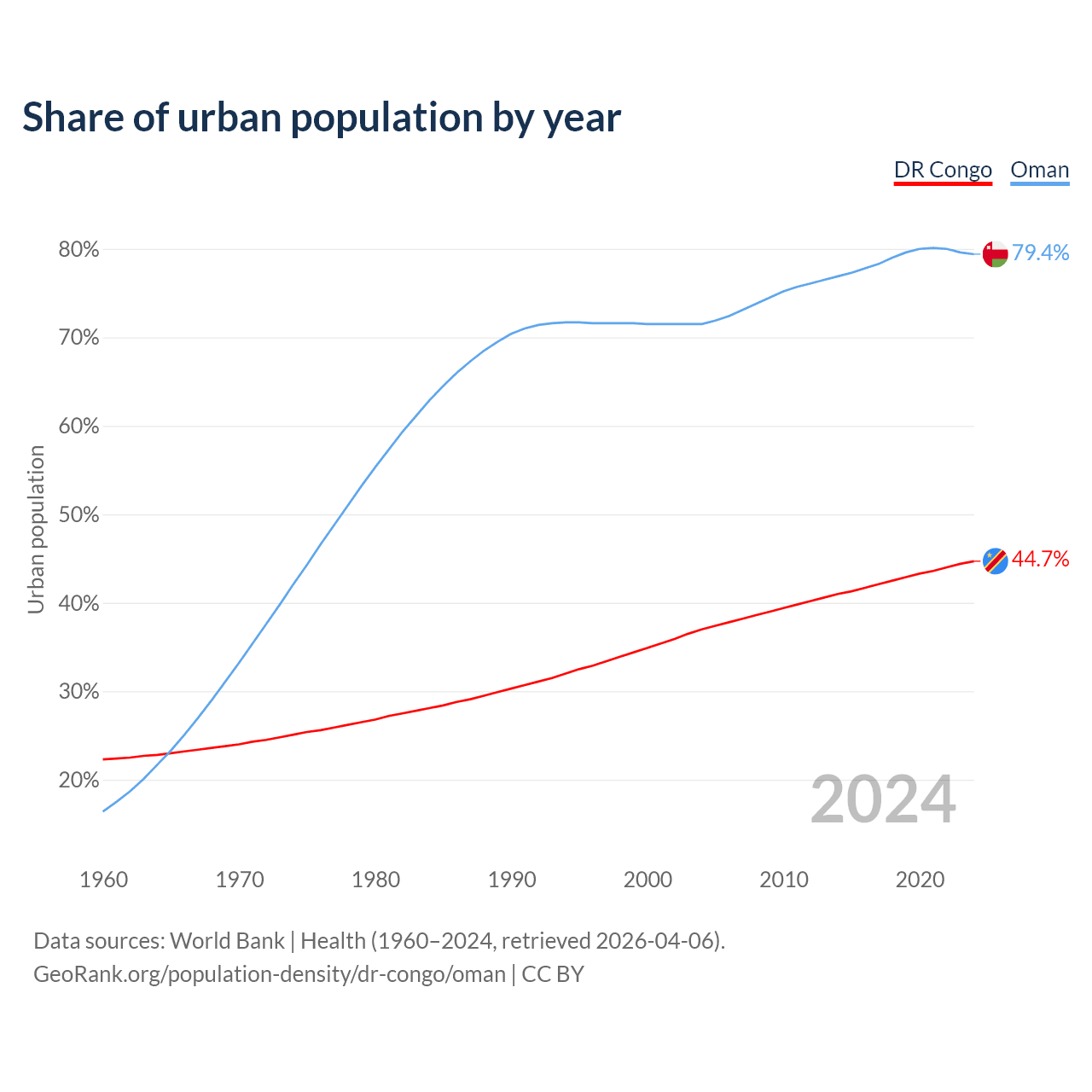 From 2004 to 2024, the share of urban population changed from 37% to 44.7% in the DR Congo and from 71.5% to 79.4% in Oman.