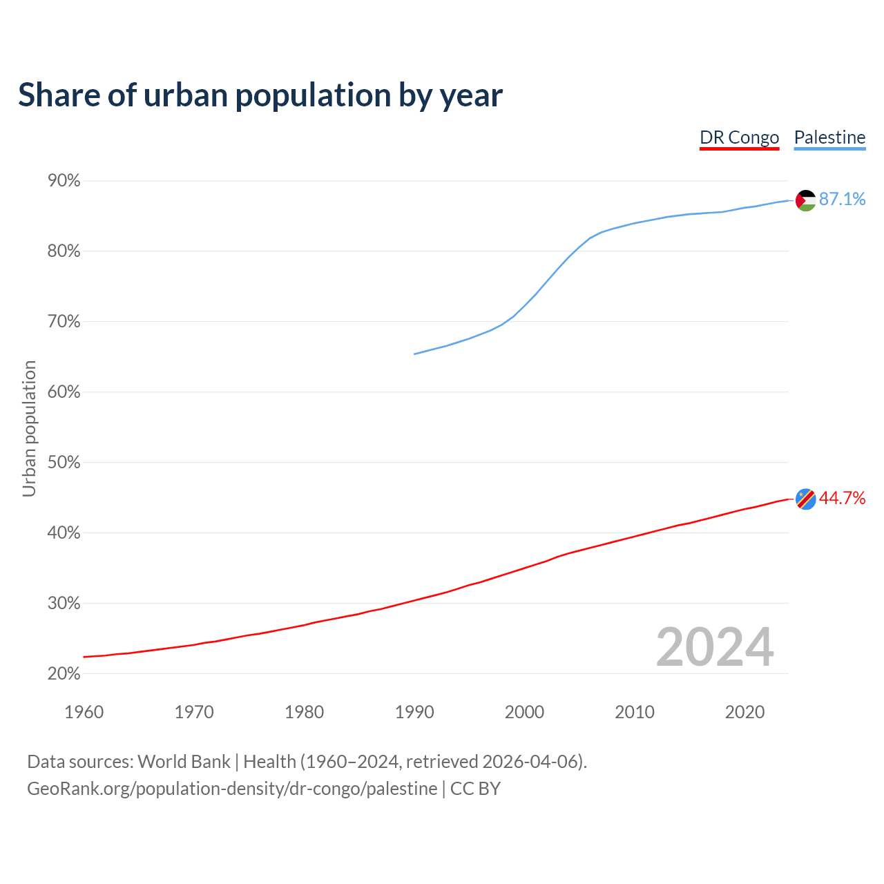 From 2004 to 2024, the share of urban population changed from 37% to 44.7% in the DR Congo and from 79% to 87.1% in Palestine.
