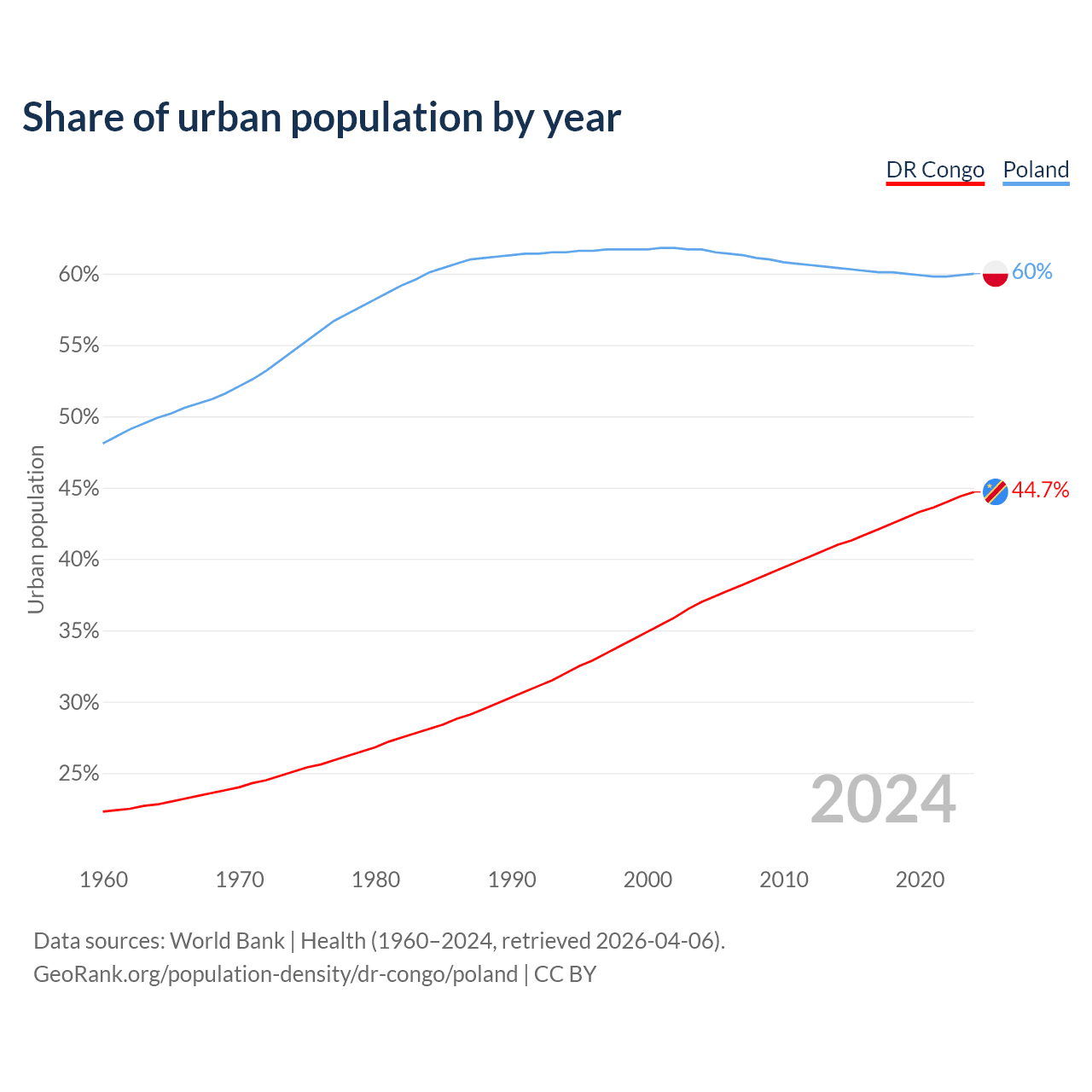 From 2004 to 2024, the share of urban population changed from 37% to 44.7% in the DR Congo and from 61.7% to 60% in Poland.