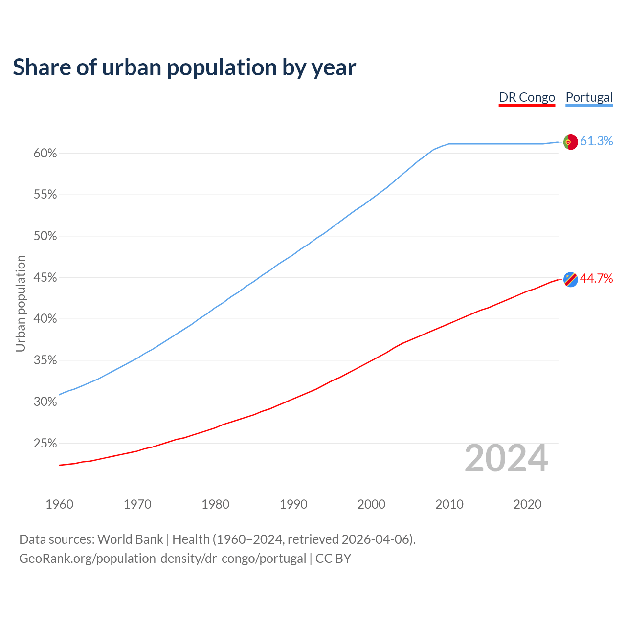 From 2004 to 2024, the share of urban population changed from 37% to 44.7% in the DR Congo and from 57.4% to 61.3% in Portugal.