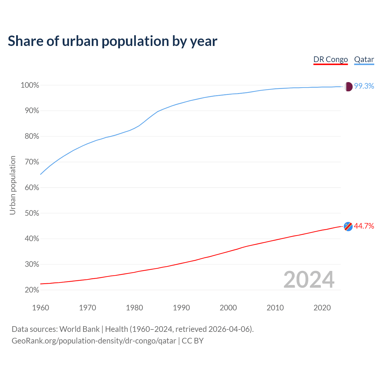 From 2004 to 2024, the share of urban population changed from 37% to 44.7% in the DR Congo and from 97% to 99.3% in Qatar.