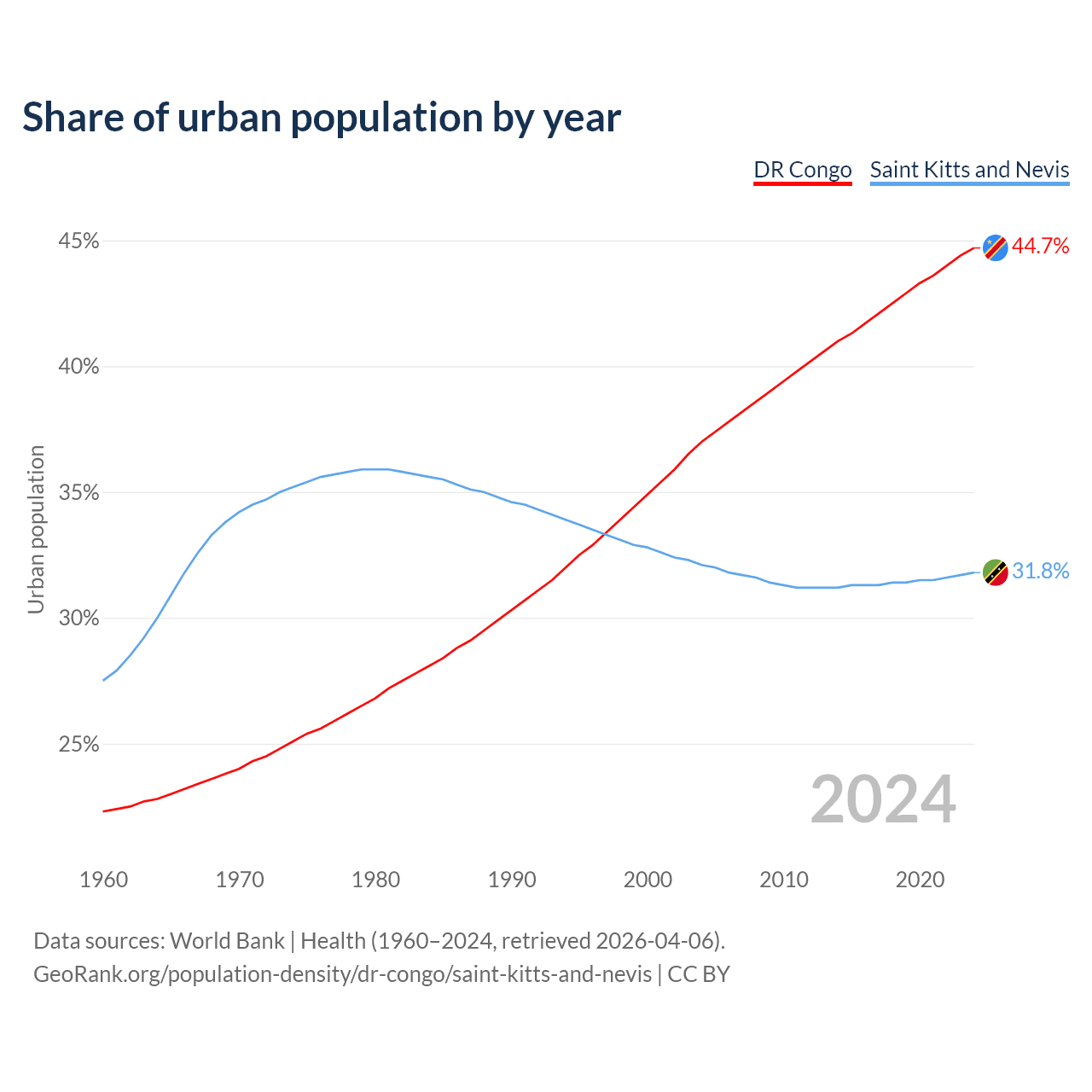 From 2004 to 2024, the share of urban population changed from 37% to 44.7% in the DR Congo and from 32.1% to 31.8% in Saint Kitts and Nevis.