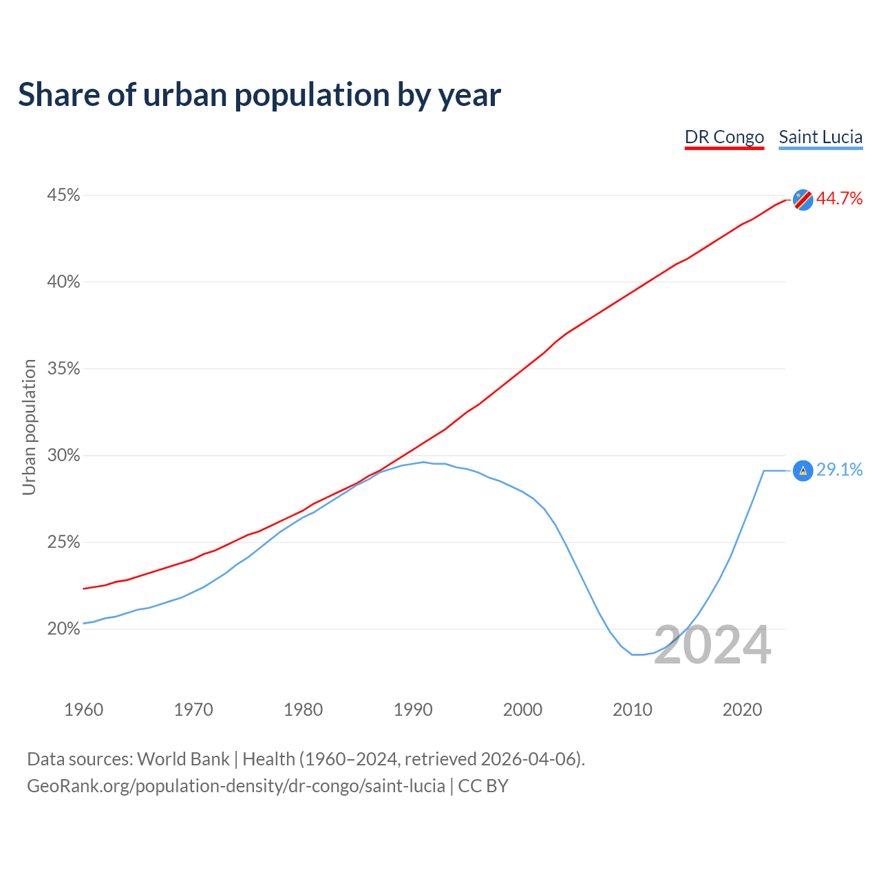 From 2004 to 2024, the share of urban population changed from 37% to 44.7% in the DR Congo and from 24.8% to 29.1% in Saint Lucia.