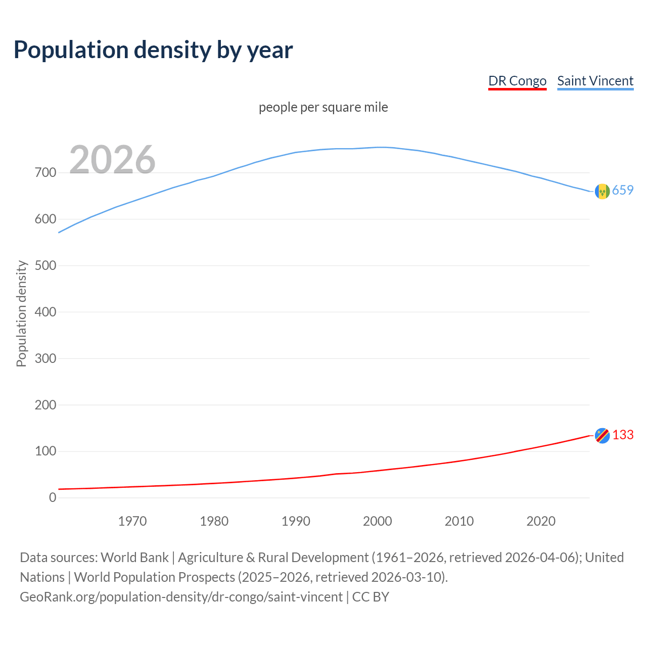 From 2006 to 2026, population density in the DR Congo increased by 92.2%, compared to a 11.4% decline in Saint Vincent.