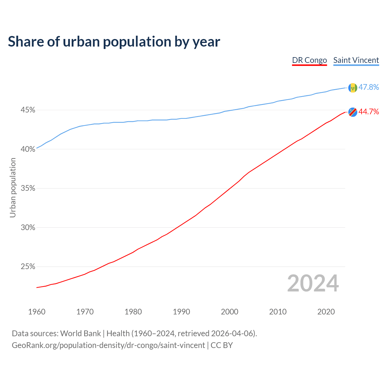 From 2004 to 2024, the share of urban population changed from 37% to 44.7% in the DR Congo and from 45.4% to 47.8% in Saint Vincent.