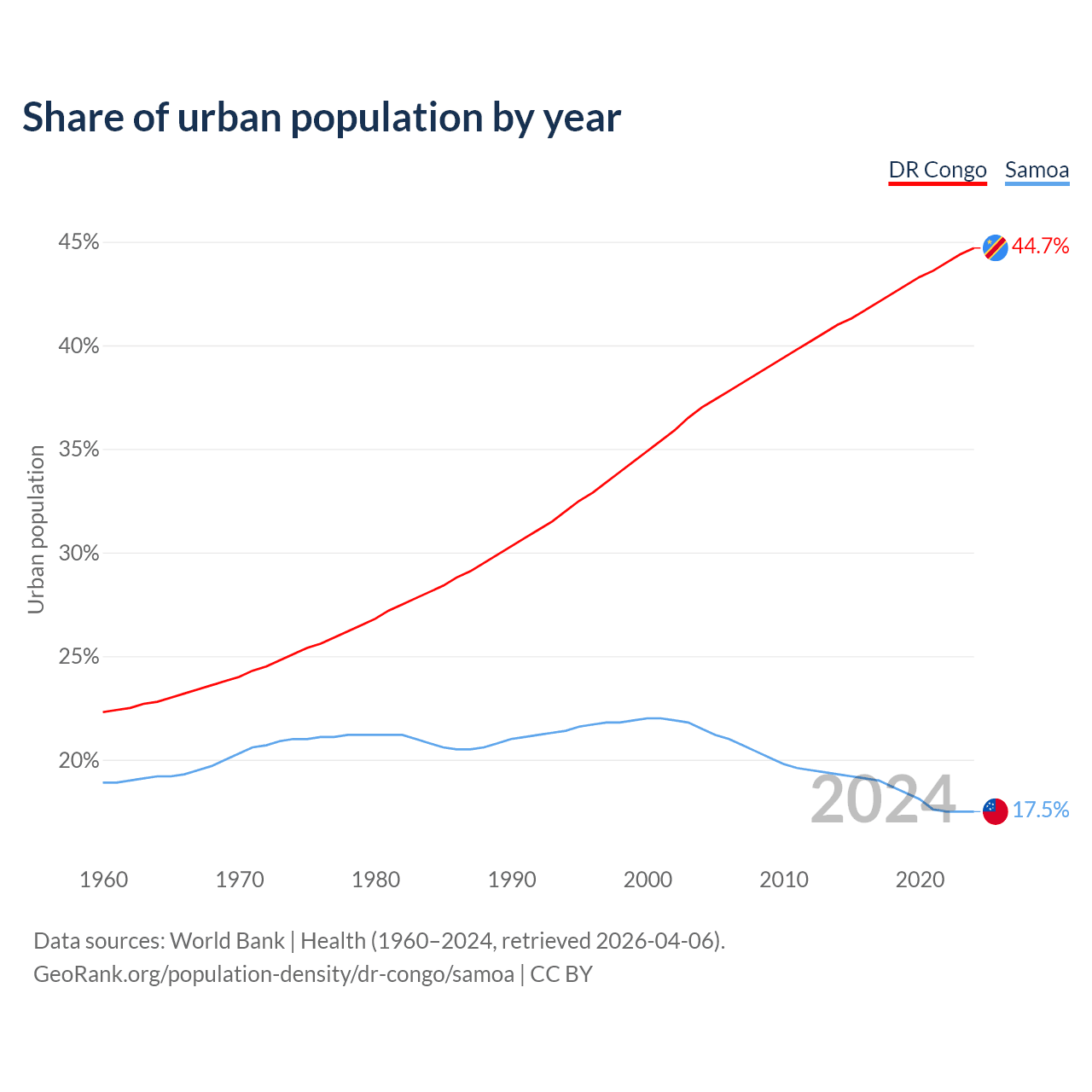 From 2004 to 2024, the share of urban population changed from 37% to 44.7% in the DR Congo and from 21.5% to 17.5% in Samoa.