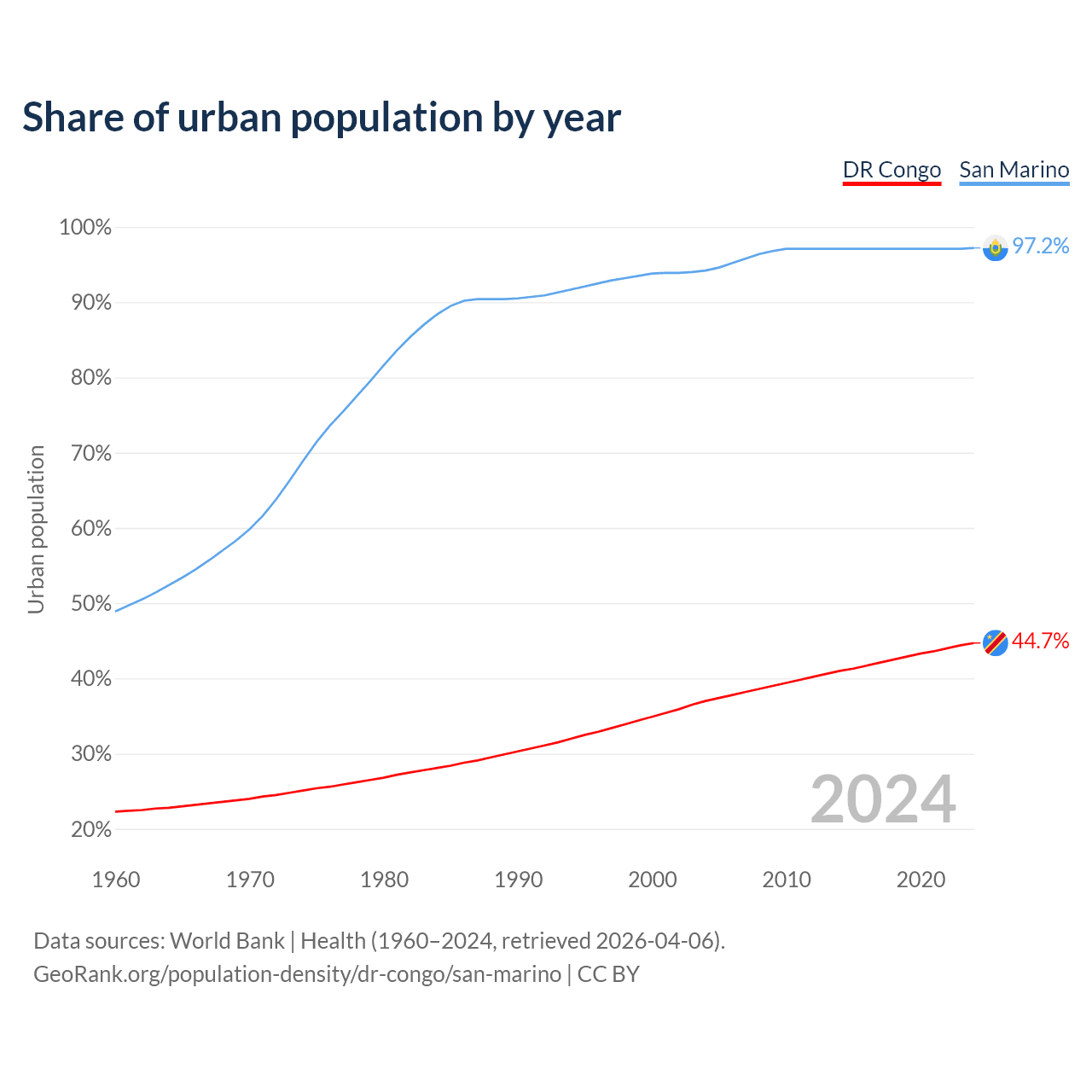 From 2004 to 2024, the share of urban population changed from 37% to 44.7% in the DR Congo and from 94.2% to 97.2% in San Marino.